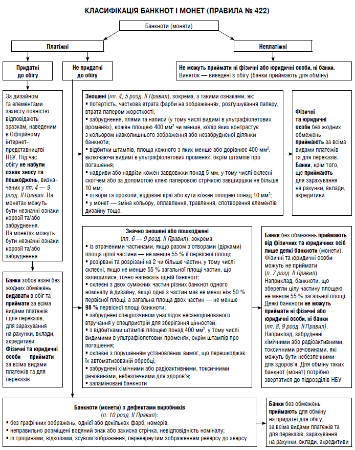 Платіжні банкноти (монети) — це ті, які можна приймати (у деяких випадках — не можна не приймати, у деяких — не можна приймати) за всіма видами платежів, для зарахування на рахунки, вклади, акредитиви. Саме з ними найчастіше мають справу громадяни та суб’єкти господарювання. «Що це таке і з чим їх їдять», ви можете дізнатися зі схеми, наведеної на с. 8.